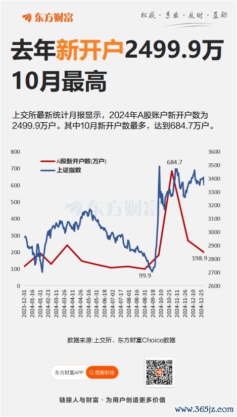 上海证券交易所新发布的统计月报显示,2024年A股账户新开户数为2499.9万户,相较于2023年的2144.3万户加杠杆买股票怎么操作?,增长16.6%。其中四季度A股账户新开户数1153.4万户,占全年的46.1%。其中10月份为684.7万户,为2024年最高月份。